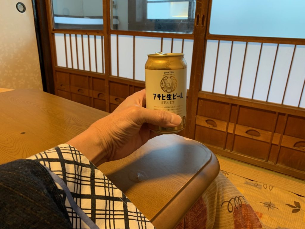 さてひと風呂浴びて、コタツに入って浴衣での一杯は至福のひととき、、お疲れ生です!