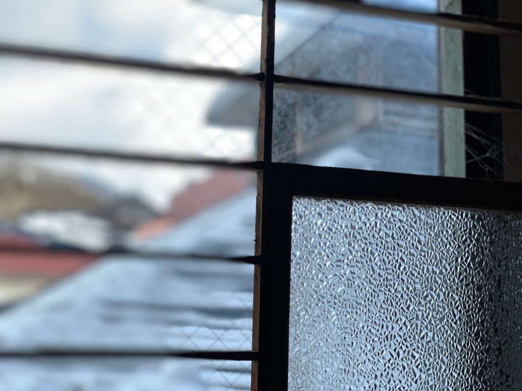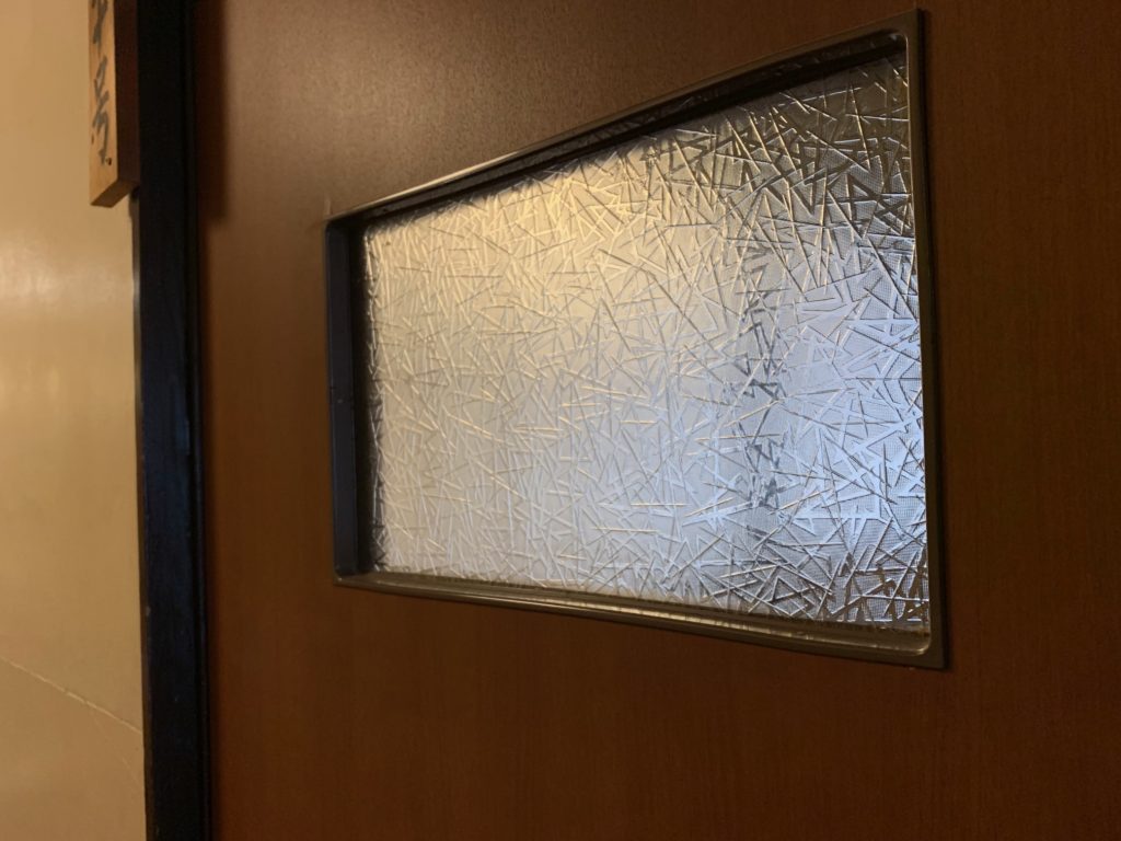湯治部廊下端っこの格子ガラス、その奥のやぐらは例の白猿の湯の木造の天井の大屋根です
