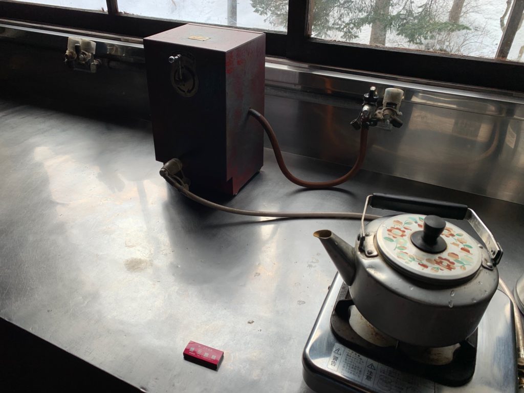 共同炊事場での湯沸かし、この木彫りプレートがほっこりで!