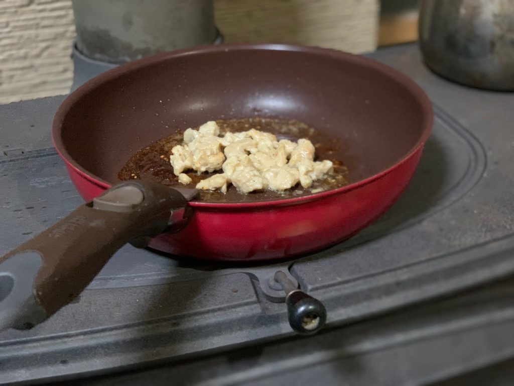 ゴッドマザーを片手に今宵の肴は牛ミノのゴマ塩を鉄板焼き(フライパン焼き)薪ストーブの前で・・・ Go to heaven!