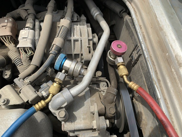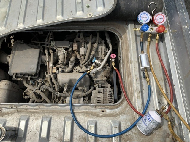 エアコンを作動させてのガス圧が(低圧1kgほど)やはり低いので、冷媒ガスをチャージします
