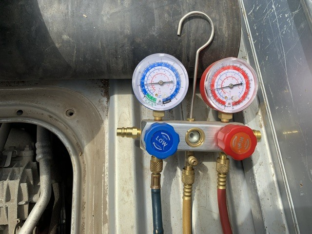 R134ガスを1本チャージして低圧:2kg、高圧:12kg(気温23℃)と数値的にはバッチリなのでコンプレッサーは問題ないと判断できます。高圧ガス配管が汚れてるので恐らく高圧側からの微小リークが有るのだと思います。冷風も充分に復活したので、リークのスパンは様子見とします。