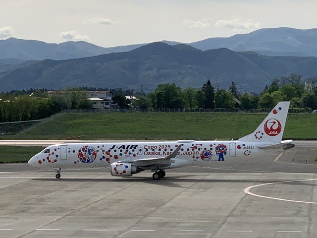 JAL ミャクミャクJET 2024年5月1日 最終更新日時 : 2024年5月1日 chevy1 たまたま伊丹空港からの便の出迎えでしたが、この機体を見れたので感激しました!(関西万博には眉をひそめますが、、、)花巻空港にて