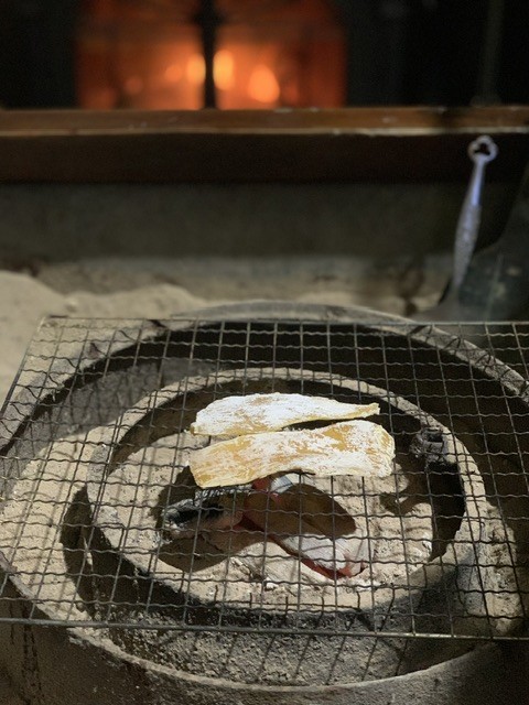 この火鉢で初クッキング、ストックしてた干しイモをあぶしてみました