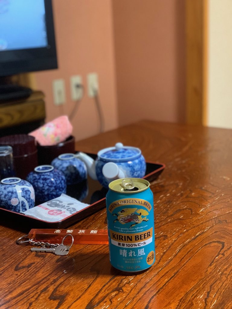 早めのチェックイン後には、スーパーオセン本店で買った肴で先ずは缶ビールで昼飲み一杯!