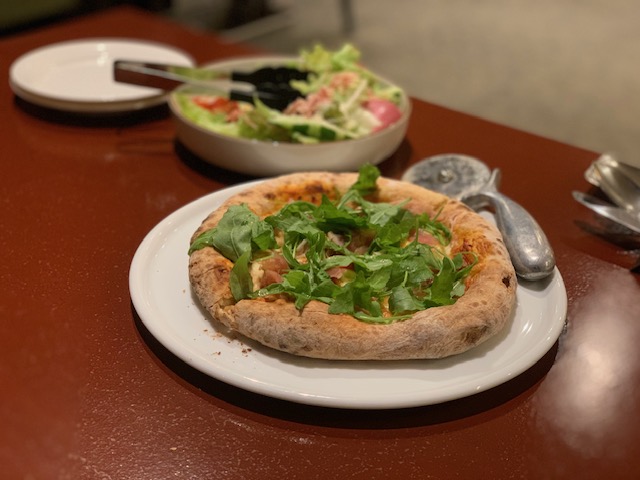 シーザーサラダとルッコラがてんこ盛りのPIZZA、どちらもとても美味しかったです