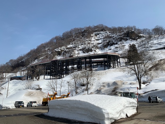 様々なイベントが開催される日帰り入浴施設「いでゆ館」前の広場から見上げる肘折希望大橋