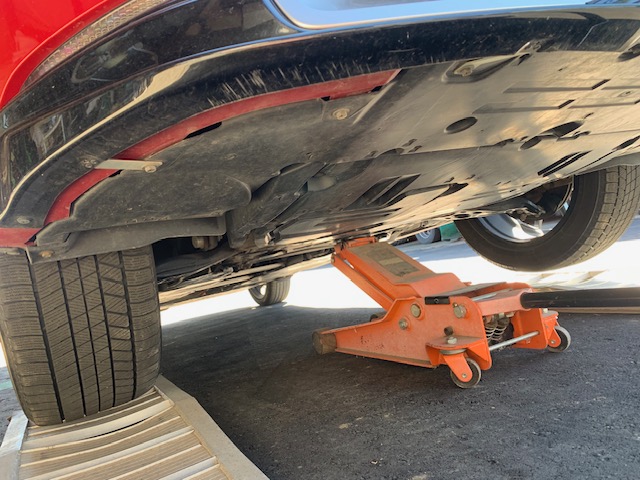 プリウス60のフロント・ジャッキアップ・ポイントはシボレーコルベットに負けないほど奥深く、ガレージジャッキを使うにはカースロープが必須です