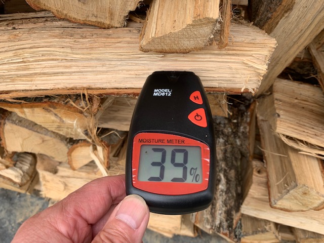割ってすぐの薪は現在40%前後の水分です、もっと暖かくなってからの伐採だったら50%以上あるので、これはラッキーです。薪に使える水分20%以下まで乾かします