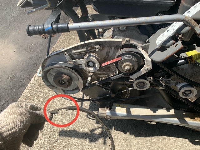 先週にエンジンオイル交換をしたついでにカバーを開けて確認したところ、走行ベルトがまさに首の皮一枚で繋がっていました💦